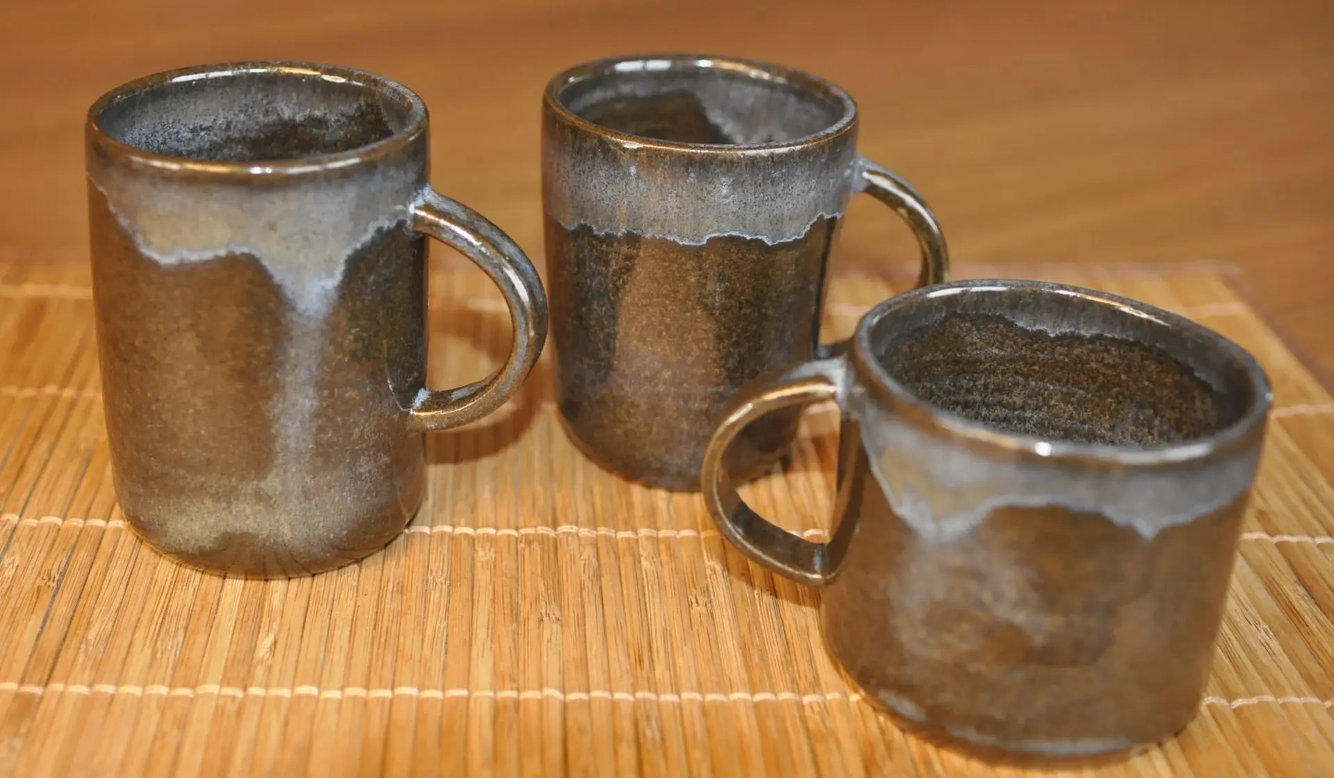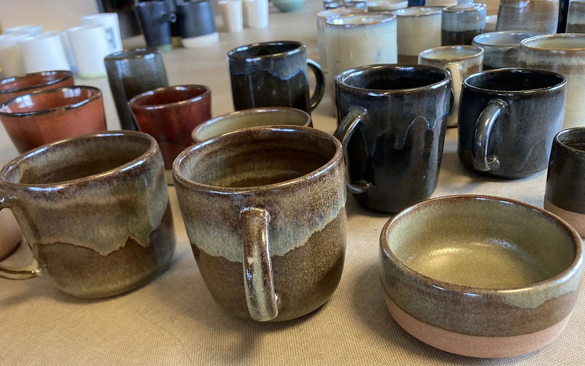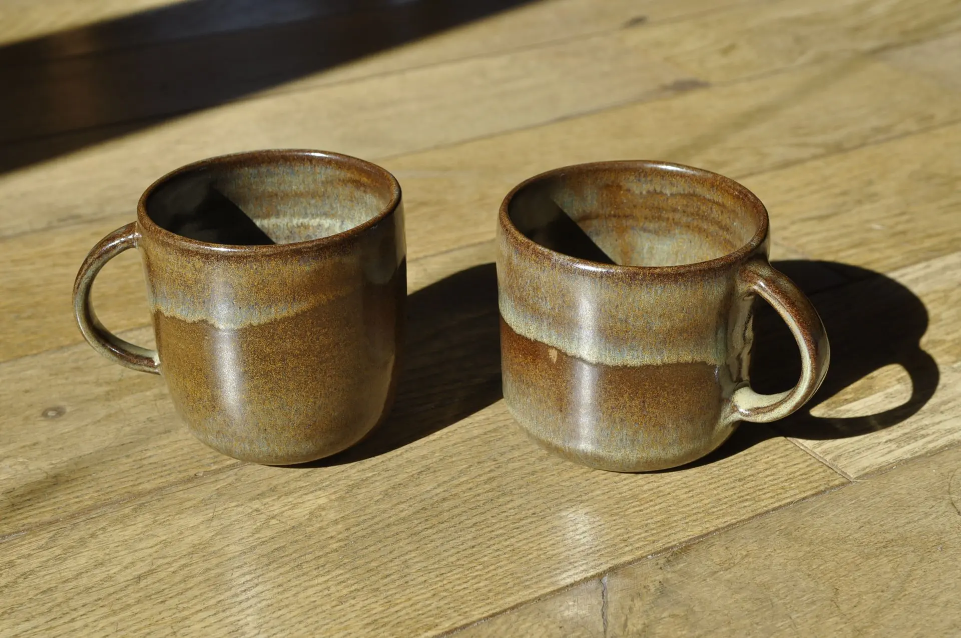 Cette série se distingue par son émail Rouge / Brun, une combinaison de teintes terrestres et profondes qui évoque la force des éléments naturels. Cet émail réactif dévoile une grande richesse de textures, allant d'un rouge brique incandescent à des nuances de brun terreux plus sombres. Le rendu final de l'émail évolue selon la couleur naturelle du grès utilisé pour le façonnage, créant un dialogue authentique entre la matière et le feu. Ce jeu de contrastes est magnifié par le liseré brun pyrité qui souligne avec caractère les contours et les bords de chaque pièce.